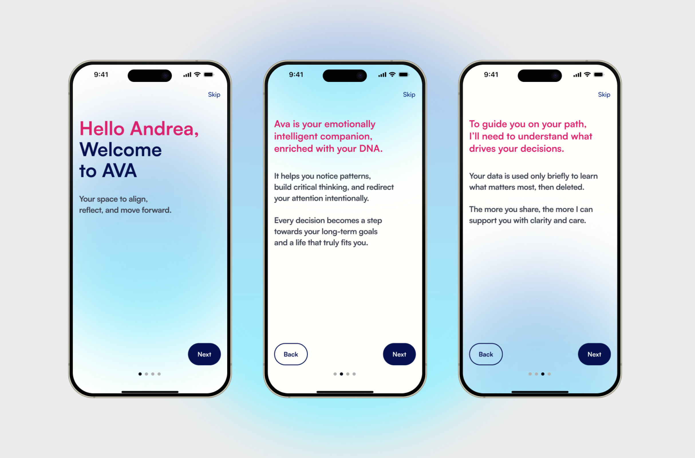 AVA is an emotionally intelligent companion for intentional living. I led a design sprint covering user research, onboarding, and a clickable iOS prototype, bringing an early concept to life. (UX/UI)